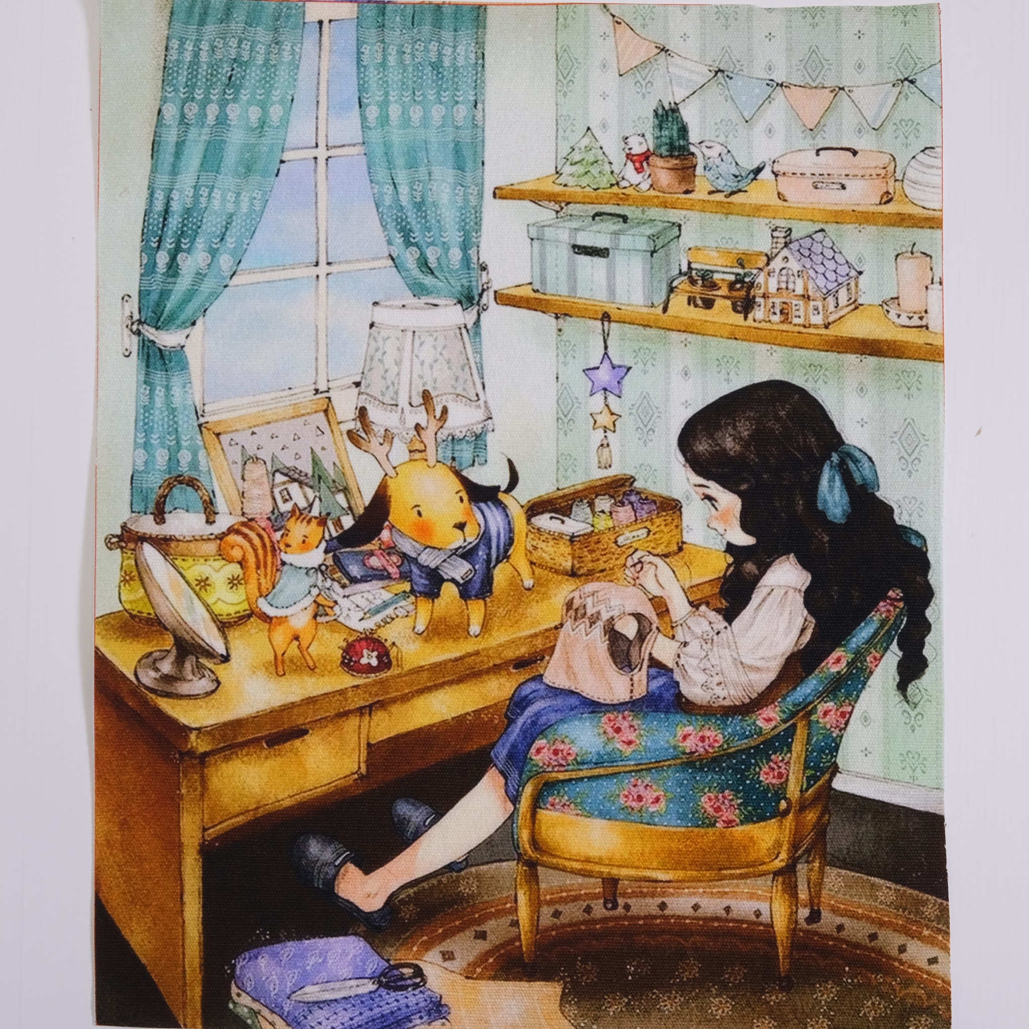 ДЕВОЧКА, ПЕСИК И РУКОДЕЛИЕ Панно, холст 25 / 20 см