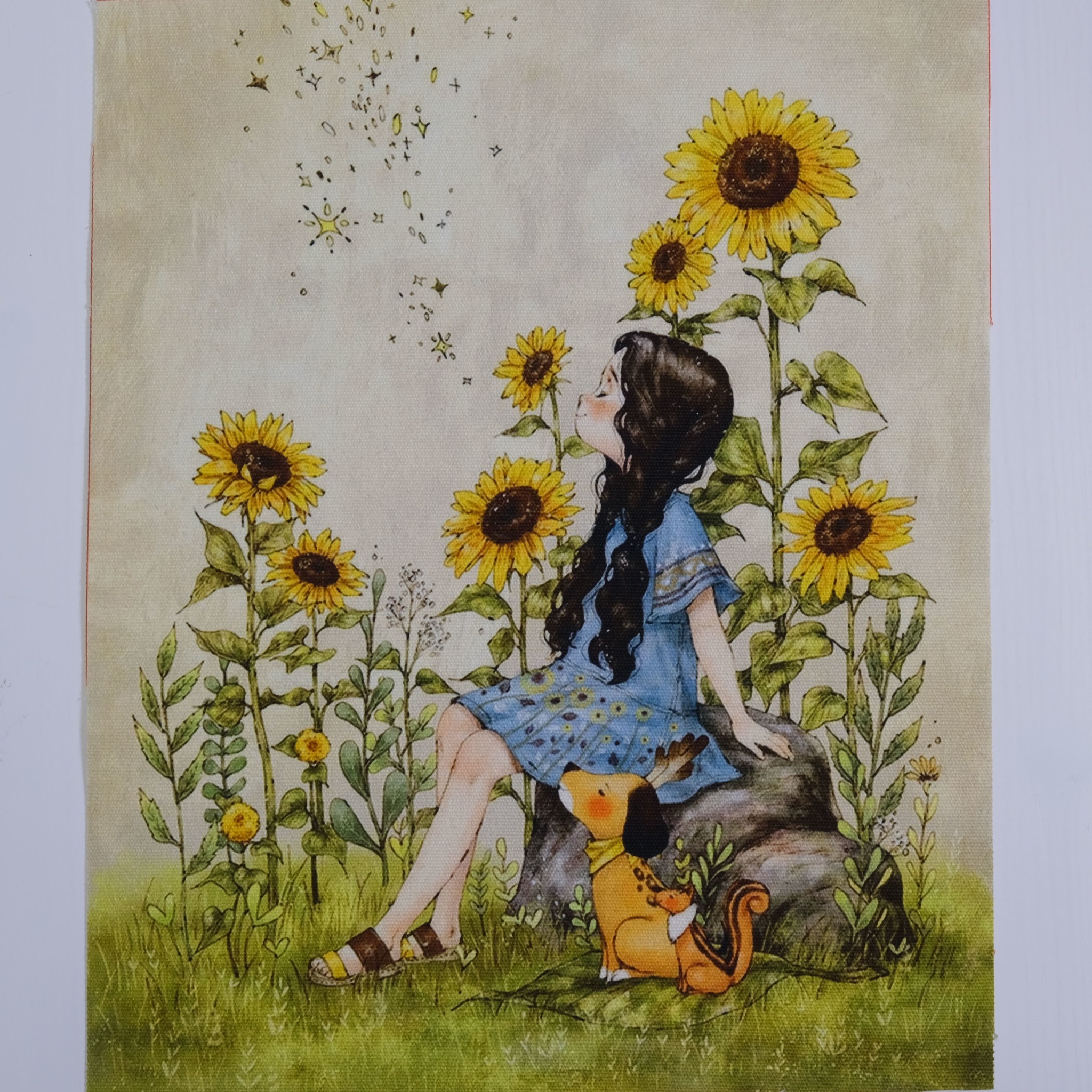 ДЕВОЧКА, ПЕСИК И ПОДСОЛНУХИ Панно, холст 25 / 20 см